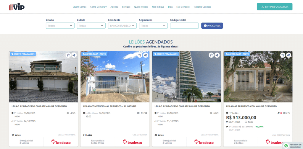 Os leilões do Bradesco são realizados em parceria com plataformas especializadas, como a Leilão VIP, que reúne imóveis disponíveis em todo o país.